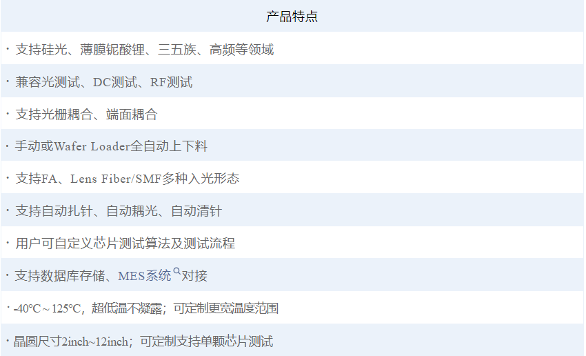 驛(yì)麻豆免费视频目前已持續推(tuī)出數台全自動化晶圓測試係統,可同時兼容自動化上下料、高低溫、光柵耦合以及端麵耦合;設備已廣(guǎng)泛在線應用於國內外頭部FablessIDM等客戶群體;係統核心功能指標如(rú)下,歡迎廣大(dà)客戶垂詢了解。